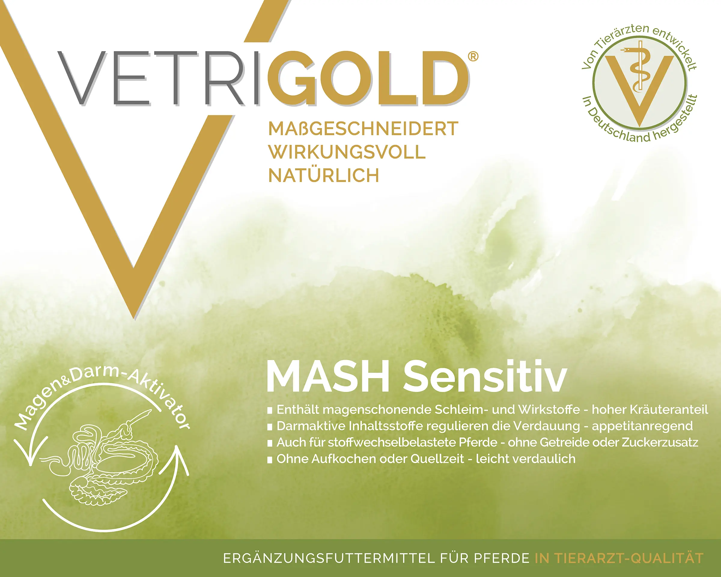 Mit VETRIGOLD® MASH Sensitiv erhalten Sie ein hochwertiges Mischfutter in Tierarzt-Qualität, das Ihrem Pferd auch bei Problemen mit der Verdauung, Futtersensibilität, Kolikneigung und allgemeinen Verdauungsbeschwerden bedenkenlos verfüttert werden kann. Die regelmäßige Fütterung eines MASH erhöht die Verdauungsaktivität, fördert eine gesunde Darmschleimhaut und liefert wertvolle Nähr- und Vitalstoffe für Ihr Pferd.