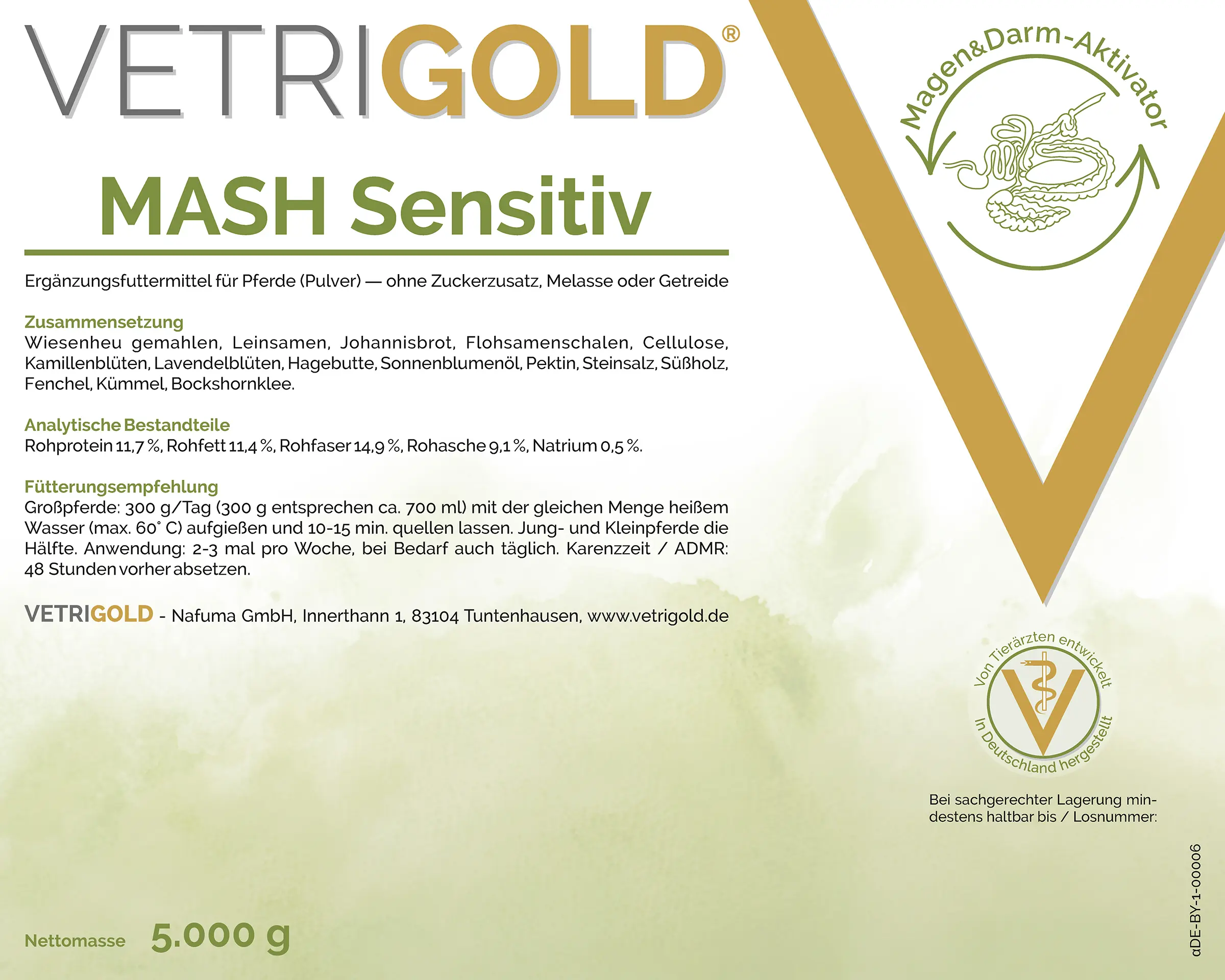 VETRIGOLD® MASH Sensitiv ist ein ideales, getreidefreies Zusatzfutter für Pferde mit empfindlicher Verdauung. Die einzigartige Zusammensetzung aus hochwertigen Zutaten wie luzernefreiem Alpenwiesen-Grünmehl, Leinsamen, Johannisbrot, Flohsamenschalen, natürlichen Pflanzenfasern (Cellulose), Kamillenblüten, Lavendelblüten, Hagebutte, Pektin, Steinsalz, Süßholz, Sonnenblumenöl, Fenchel, Kümmel und Bockshornklee unterstützt die Verdauung Ihres Pferdes und fördert dessen Darmgesundheit auf natürliche Weise.